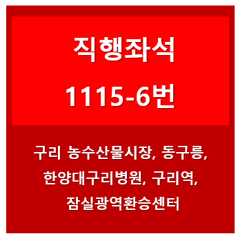 구리시 직행좌석버스 1115-6번은 인창동 농수산물시장을 출발하여 동구층, 한양대 구리병원, 구리역을 지나 잠실광역 환승센터로 가는 버스입니다.
