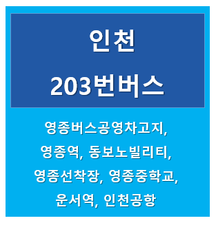 인천 203번 버스는 영종도를 운행하는 노선버스 입니다. 영종역, 동보노빌리티, 영종선착장, 운서역을 지나 인천공항으로 가는 버스노선 입니다.