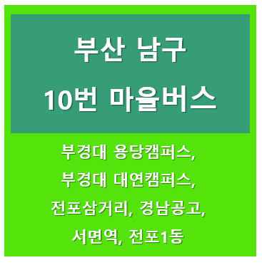 부산광역시 남구 10번 마을버스는 부경대 용당캠퍼스를 출발하여 부산문화회관, 부경대대연캠퍼스, 경성대, 세연고교, 문현시장, 서면역을 정차 합니다.